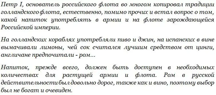 Таким образом, на русском флоте выдача водки была не только частью снабжения, но и как поощрение, которое регулировалось капитаном.