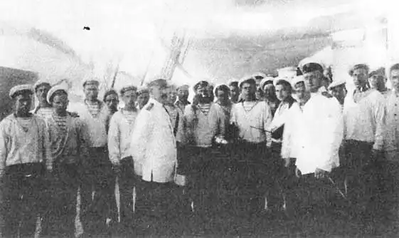 Интересно при этом отметить, что каждый, подходя, снимал фуражку и пил чарку с непокрытой головой. Делалось это в силу постоянного обычая отдания уважения шканцам и флагу. Баталер отмечал в книге всякого выпившего чарку...."
