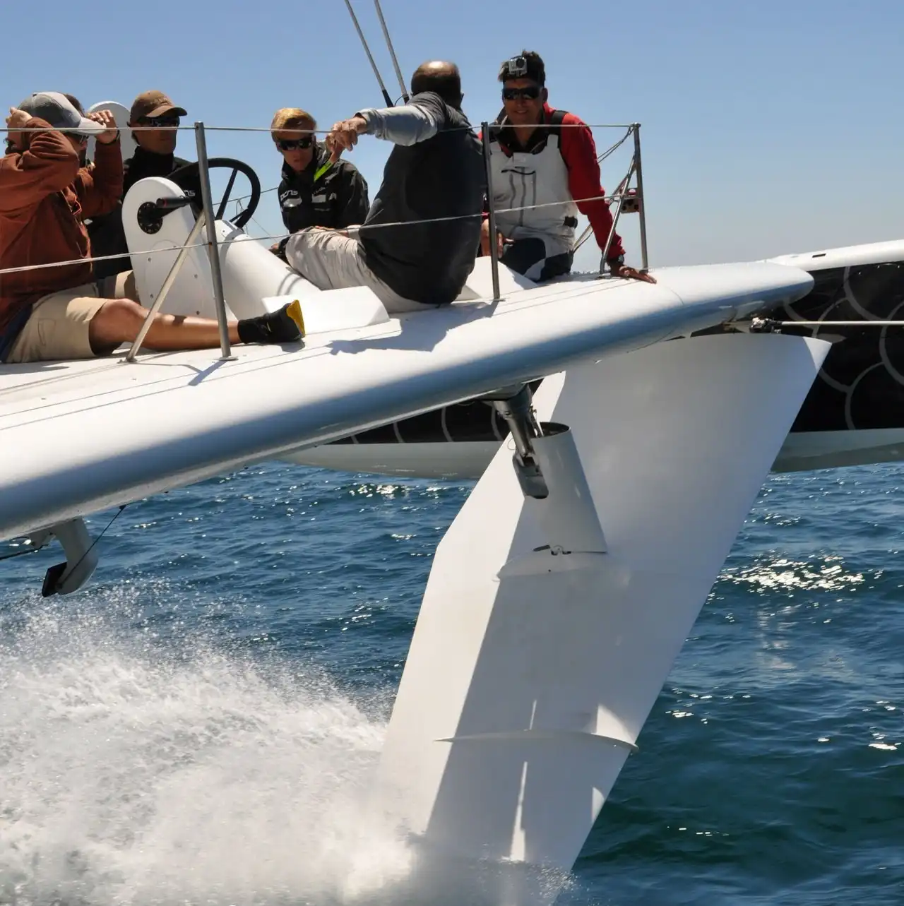 При этом он не плывет по воде, а парит над ней. Чем больше парусник Hydroptere набирает скорость, тем выше он поднимается над поверхностью на подводных крыльях. В итоге площадь соприкосновения корпуса с водой сокращается до минимальных двух квадратных метров.