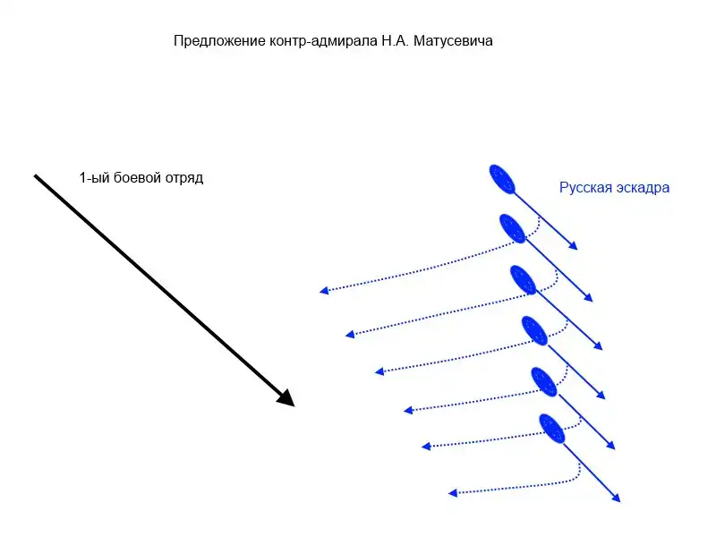 Предложение контр-адмирала Н.А. Матусевича гораздо интереснее. Выстроившись уступом, русская эскадра получала возможность сделать поворот «все вдруг» и бросится в атаку на не ожидающих такого японцев. Подобная атака могла бы привести к тому, что Х. Того замешкается, и правильный бой превратится в свалку, в которой у русской эскадры, имевшей под рукой миноносцы и крейсера, могло оказаться преимущество.