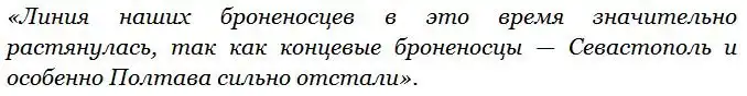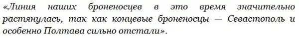 «Полтава» отставала «особо сильно» по вполне понятной причине — в 1-ой фазе русские корабли не получили критичных повреждений, но осколком снаряда на «Полтаве» попал в подшипник машины, отчего та стала разогреваться и пришлось уменьшать ход, что подтверждено множеством источников. Кроме того, в этом вопросе официальную точку зрения подтверждают воспоминания старшего офицера «Полтавы» С.И. Лутонина: