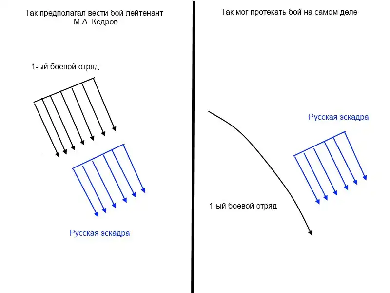 К сожалению, следует признать, что идея о движении строем фронта никуда не годится. Конечно, если бы вдруг Х. Того принял «правила игры», предлагаемые ему русским командующим, то это привело бы к некоторому преимуществу русских, вот только зачем бы японцам так подставляться? Ничто не мешало 1-ому боевому отряду догонять русских не разворачиваясь в строй фронта, как ожидал лейтенант М.А. Кедров, а следуя кильватерной колонной, и в этом случае 1-я Тихоокеанская сразу попадала под «палочку над Т» и разгром.