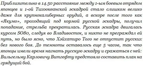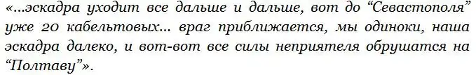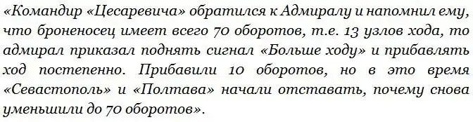 Русская эскадра после 14.50 имела хода 13 узлов (Вл. Семенов, кстати, пишет о 12-13 узлах). «Севастополь» шел в строю, но поврежденная «Полтава» постепенно отставала. Затем, как пишет «Русско-японская война 1904-1905 гг» (кстати, противореча самой себе):
