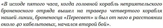 К сожалению, начало второго боя представляет собой большую загадку, потому что свидетельства очевидцев и официальные документы прямо противоречат друг другу и сопоставление их абсолютно ничего не проясняет. Неясно время возобновления боя, неясна скорость русских кораблей, непонятна позиция японской и русской эскадр на момент открытия огня…