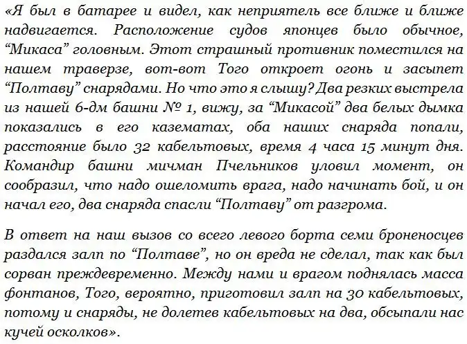 Трудно сказать, попал ли мичман в «Микасу», или нет. С одной стороны, японская сторона не фиксирует попаданий во флагман Х. Того в 16.15 или сколько-то близкое к этому время, но с другой стороны, время попаданий нескольких шестидюймовых (и неопознанного калибра, которые вполне могли быть шестидюймовыми) снарядов на зафиксировано. Так что можно говорить о том, что японские источники не подтверждают и не опровергают попадания мичмана Пчельникова. Эти попадания, или же просто сам факт того, что «Полтава» открыл огонь заставил японцев занервничать и нанести удар раньше времени. Вполне возможно, что японцы действительно попытались одним точным залпом всех кораблей линии выбить из строя «Полтаву» (сходные приемы стрельбы предусматривались и старыми отечественными наставлениями по морской стрельбе), но выстрелили раньше времени и от этого промахнулись.