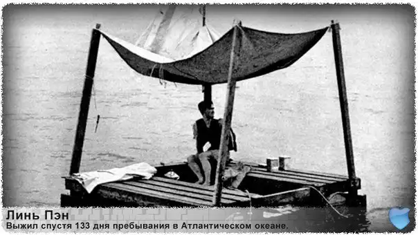 Случай с Линь Пэном, моряком из Китая, довольно старый, но не один раз служил примером для других мореплавателей. Так, в 1942 году Линь Пэн провел 133 дня в Атлантическом океане. В то время он проходил службу на судне, которое держало путь до Голландской Гвианы под флагом Великобритании. Во время перехода корабль был подорван германской подлодкой. Линь Пэн спасся чудным образом, прыгнув с борта корабля в океан еще до начала взрыва. Он дрейфовал в воде несколько часов, потом он обнаружил плот со спасательными принадлежностями, оставшийся от его судна. Ему повезло, там находилась пара дымовых шашек, электрический фонарик, питьевая вода, шоколад, сахар и печенье. На первое время ему хватило этих небольших съедобных припасов. Моряк, дрейфуя на плоту по Атлантическому океану, собирал дождевую воду и ел сырую рыбу, которую ловил импровизированной удочкой, а однажды ему удалось поймать чайку и высосать из неё кровь.