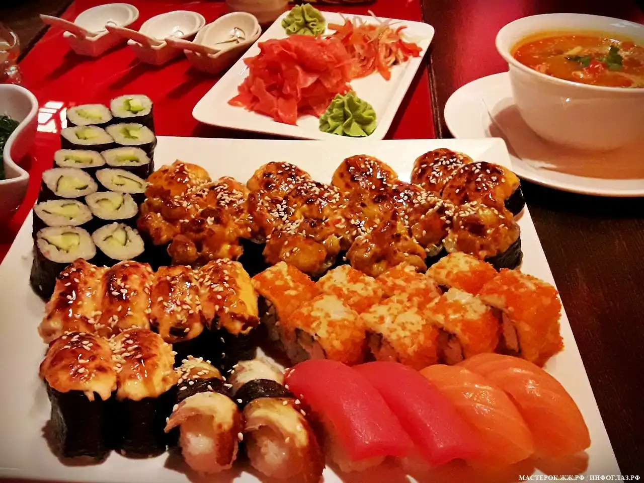 Более того, имбирь – это прекрасный природный антиоксидант. Корень имбиря поможет не только предотвратить заражение паразитами и бактериями, которые могут содержаться в сырой рыбе. Он позволит также легко и быстро усвоить пищу, улучшит секрецию желудка, а при постоянном употреблении — гарантированно поможет снизить количество холестерина в крови.