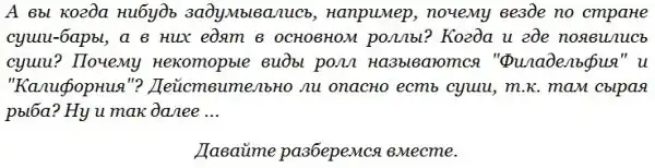 Да и доставка в максимально естественном состоянии — охлажденном и на льду — дело хлопотное и трудно выполнимое. Если учесть, что рыба и прочие морские деликатесы — продукт скоропортящийся и в несвежем виде даже опасный, риск отравления действительно высок. Впрочем, неприятного недуга можно избежать. Первое правило — не покупать суши в супермаркетах или сомнительного вида забегаловках. Если уж хочется окунуться в атмосферу изысканной японской кухни, лучше посетить суши-бар с хорошей репутацией.