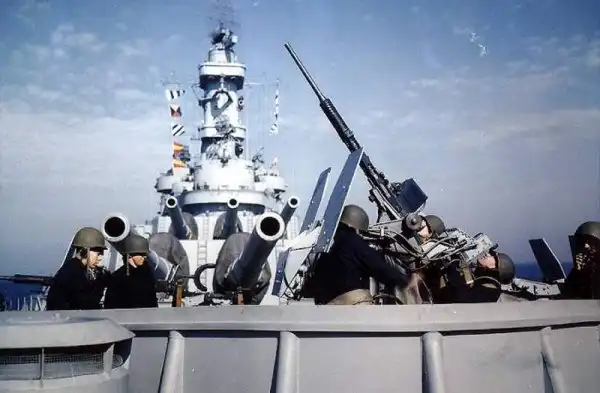 Факт №4. Помимо универсальных орудий калибра 127 мм и шести десятков мелкокалиберных зениток, американские линкоры штатно несли 19 счетверенных установок «Бофорс» (76 стволов).