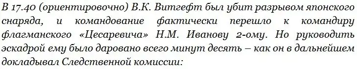 На самом же деле единственная проблема заключалась в отсутствии инструкций на случай гибели командующего, которые В.К. Витгефт просто обязан был дать перед боем: но он их не дал и теперь командиры кораблей могли только гадать, как им должно вести себя в подобной ситуации.