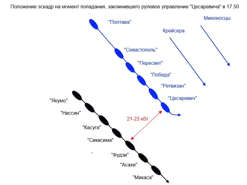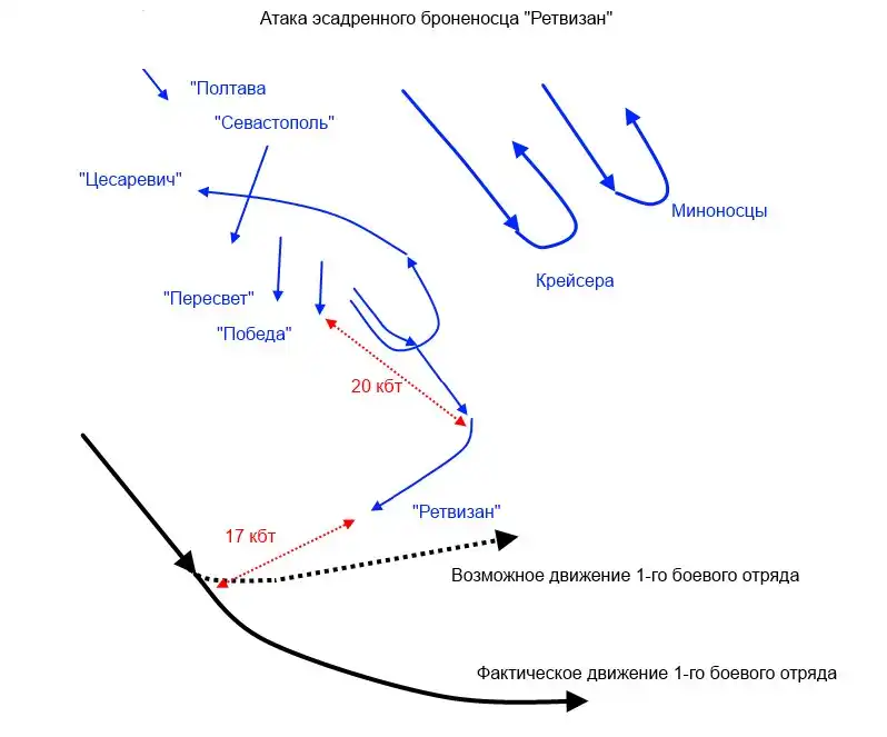 Командир «Ретвизана», Э.Н. Щенснович, полагая, что младший флагман П.П. Ухтомский убит или ранен, все еще пытался вести эскадру на противника. Однако строй нарушился и «Ретвизан» остался один, при том, что расстояние между ним и «уворачивающимся» от «Цесаревича» «Победой» быстро возрастало и могло достичь 20 кбт (хотя цифра несколько сомнительна). Почему так получилось?