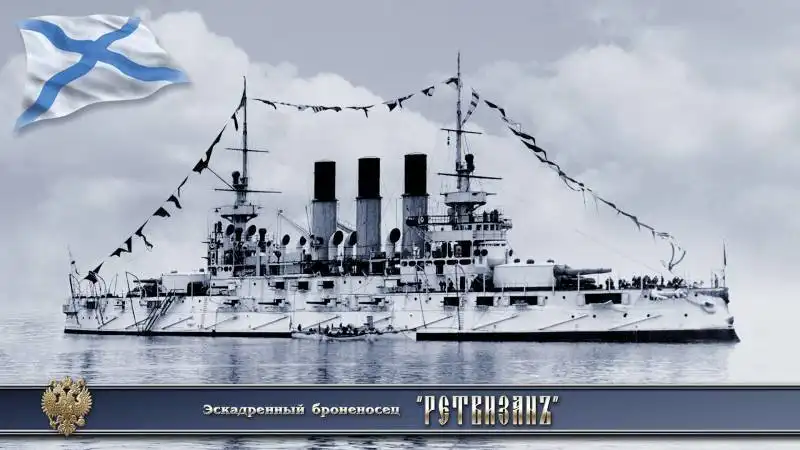 «Ретвизан» - поначалу следует за «Цесаревичем», и даже начинает вслед за ним ворочать влево, но, «пройдя четверть окружности», на броненосце понимают, что «Цесаревич» больше не ведет эскадру. Все взоры обращаются на «Пересвет» князя П.П. Ухтомского, но что видят с «Ретвизана»? Броненосец младшего флагмана сильно избит (это бы самый пострадавший в артиллерийском бою русский броненосец), на нем сорваны стеньги и фалы, флага младшего флагмана нет. «Пересвет» ничего не предпринимает самостоятельного, а просто идет в кильватер «Победе». Из всего увиденного на «Ретвизане» делают вполне логичный (но неверный) вывод – скорее всего, П.П.Ухтомский также пострадал и не может вести эскадру, соответственно, делать это предстоит «Ретвизану». Э.Н. Щенснович возвращает свой броненосец на обратный курс.
