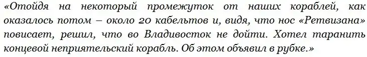 Первое, что хотелось бы отметить – у Э.Н. Щенсновича оставалось очень немного времени для исполнения своего замысла. Предположим, что в момент поворота на таран «Ретвизан» отстоял от японской линии на 20 кбт, но даже если скорости русского и японских кораблей были бы равными, то за то время, пока «Ретвизан» преодолеет эти 20 кбт, японская линия также уйдет вперед на 20 кабельтов, т.е. на 2 мили. Много это или мало? Если даже принять, что интервалы между японскими броненосными кораблями составляли 500 м, то и в этом случае длина их линии из 7 кораблей не превышала 3,5 миль, но скорее она была короче.