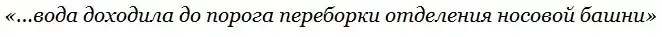 Но это было и все. С другой стороны, к вечеру погода посвежела, а направление зыби было таким, что волны били как раз в правую скулу «Ретвизана», где располагалась поврежденная плита. И еще – на скорость поступления воды могли повлиять энергичные маневры «Ретвизана», когда тот сперва пытался двигаться за «Цесаревичем», а затем вернулся на прежний курс. Вторая версия выглядит наиболее правдоподобной – с учетом того, что, когда «Ретвизан» пошел против волны на таран, затопление возросло настолько, что вызвало беспокойство старшего офицера, покинувшего свое место в кормовой артиллерийской башне и ринувшегося в нос, разбираться что же там случилось. Но обо всем по порядку.