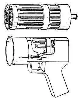 В этой конструкции использовались снаряды «Ланседжет» (Lancejet — «реактивная острога»), созданные калифорнийской фирмой М.В.А. в рамках работ над реактивным стрелковым оружием (см.). Снаряд имел калибр 6,4 мм, длину 300 мм, стартовую массу 55,7 г, пороховой реактивный двигатель. Под такие снаряды были выполнены из алюминиевого сплава пусковые устройства длиной 456 мм — однозарядное с неснаряженной массой 0,45 кг и шестизарядное массой 0,68 кг.