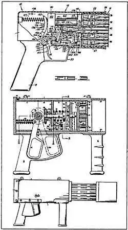 Винтовка получилось внешне схожим с рассмотренной выше конструкцией Ламберта, но принципиальным отличием является вращающийся барабан с блоком из 13 пусковых трубок с реактивными стрелами и неподвижными бойками. Оружие представляет собой по сути громоздкий револьвер. Трубки расположены в барабане следующим образом: одна — в центре, а вокруг центральной трубки двумя концентрическими окружностями расположены еще 12 (по 6 в каждом ряду). Ударников три: один центральный и по одному для каждого (внешнего и внутреннего) ряда трубок.