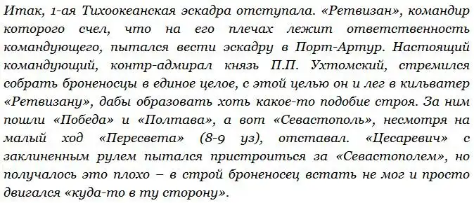 Действия П.П. Ухтомского следует считать верными: но следует признать и то, что поворот «Ретвизана» и «Пересвета» в Порт-Артур вызвал известную сумятицу среди командиров кораблей и флагманов эскадры. Они оказались в чрезвычайно сложном положении. С одной стороны, Государь Император приказал идти во Владивосток, а приказы нужно выполнять. С другой стороны, видно было, что эскадра не может сейчас продолжить сражение, а значит, ей следует возвратиться в Артур. Но выйдет ли она из Артура повторно? Будет ли еще одна попытка прорыва? Командиры оказались перед чрезвычайно неприятным выбором. Выполнить приказ Государя и идти во Владивосток? И тем ослабить эскадру, когда она, собравшись с силами и починившись, вновь пойдет на прорыв? Не попахивает ли такой поступок позорным бегством? Или вернуться вместе со всеми в Артур? И погибнуть там, если «всепресветлейшие» не санкционируют еще одну попытку прорыва? А ведь прямо сейчас есть возможность повести свой корабль на прорыв, избежать бессмысленной гибели и выполнить волю Государя?