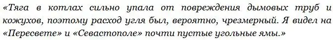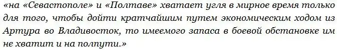 К сожалению, информация о запасах угля на «Полтаве» после ее возвращения в Порт-Артур не имеется. Но мы уже приводили слова старшего артиллериста «Пересвета» В.Н. Черкасова: