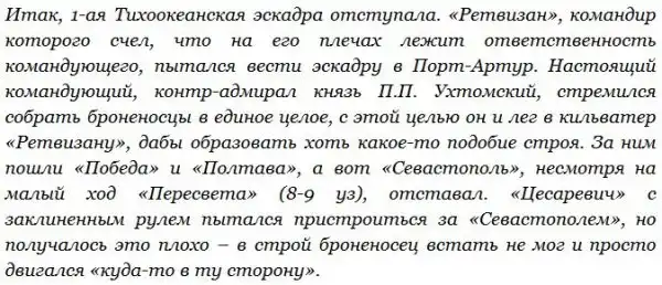 Но не эти соображения диктовали П.П. Ухтомскому возвращение в Порт-Артур: основная проблема контр-адмирала заключалась в нехватке информации – это хорошо изложено у В.Н. Черкасова: