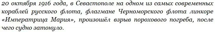 Утро 20 октября 1916 года не предвещало беды, начинался обычный день. Над Северной бухтой повседневно была дана побудка экипажам кораблей. На линкоре все шло по определенному обычному распорядку. Внезапно в 6 час. 20 мин. окрестности сотряс мощный взрыв.