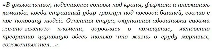 Страшной силы новый взрыв вырвал стальную мачту. Как катушку, швырнул к небу броневую рубку. Взлетела на воздух носовая дежурная кочегарка. Корабль погрузился во тьму. Корабль горел, грудами лежали тела. В некоторых казематах застряли люди, забаррикадированные лавиной огня. Выйди — сгоришь. Останешься — утонешь. Рвались погреба 130-миллиметровых снарядов. В течение часа произошло ещё около 25 взрывов. Экипаж до последнего боролся за свой корабль, много героев погибли, пытаясь потушить огонь.