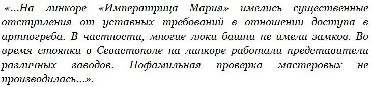 Комиссия склонялась ко второй версии (халатность), т. к. порох был, по мнению всех артиллеристов линкора качественным. Что касается злого умысла, то комиссия считала эту версию маловероятной. Хотя были установлены нарушения в правилах доступа к артиллерийским погребам и недостаток контроля за находившимися на корабле рабочими. Комиссия отмечала: