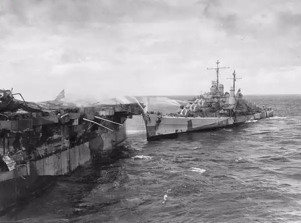 С виду авианосец еще казался мореходным, хотя все его внутренности были вырваны. Пожары не утихали, и оставалась опасность, что взорвется не затопленный носовой погреб боеприпасов. С большой неохотой командир в 16.00 приказал команде покинуть корабль.