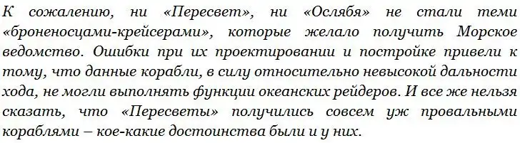 Безусловно, попытка русского флота реализовать концепцию крейсерской войны путем придания линейным силам рейдерских способностей чрезвычайно интересна. Однако такая попытка могла иметь шансы на успех лишь в том случае, если бы Российская империя создала броненосцы 1-го класса, способные к подобным операциям. Иными словами, для успешной реализации концепции «броненосцев-крейсеров» требовалось создать не «Пересветы», а корабли, во всем подобные «пятнадцатитысячным» британским эскадренным броненосцам, но при этом еще и способные длительное время пиратствовать в океане. Но такие корабли априори должны были бы стать крупнее и дороже их английских «визави», на что стесненная в средствах Российская империя пойти никак не могла…