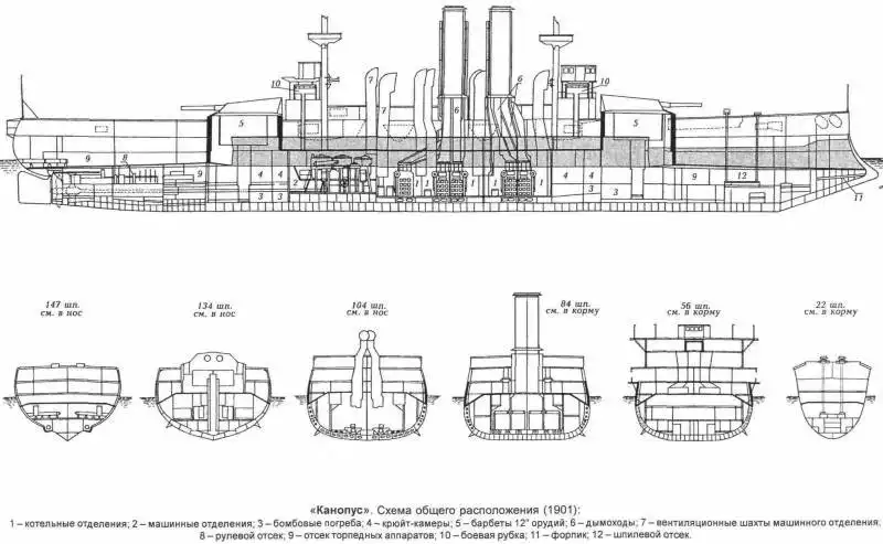 В отличие от того же «Ринауна», «Канопусы», как и «Пересветы», получили-таки прогрессивные для того времени котлы Бельвилля, с которыми новейшие британские корабли смогли развивать 18 уз (а некоторые корабли серии – и более) без форсированного дутья, т.е. по скорости Канопусы как минимум не уступали «Пересветам». Их бронирование было чуть менее мощным, но при этом более рациональным. Очень высокий, 4,26 м, бронепояс, возвышающийся над ватерлинией на 2,74 м, состоял из 152 мм бронеплит Круппа, что (по английским испытаниям) было эквивалентно примерно 198 мм гарвеевской брони. «Пересветы» несли 229 мм, но это была броня Гарвея…. На «Канопусах» англичане предусмотрели высокий пояс, прикрывающий носовую оконечность – он был весьма тонким, всего лишь 51 мм и не гарантировал, конечно, защиты оконечностей от тяжелых снарядов неприятеля.
