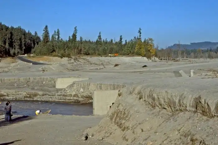 Это было боковое извержение. Вулканический купол находился на северном склоне Сент-Хеленса, и взрыв получился направленным. Верхушка «американской Фудзиямы» исчезла, на ее месте образовался уродливый кратер. Из него вниз по остаткам горы со скоростью, достигавшей несколько сот километров в час, понеслись пирокластические потоки — раскаленная смесь из пепла, вулканических газов и камней. Снег и ледники, еще сохранявшиеся на вулкане, растаяли. Вода смешалась с пеплом и горной породой, образовав т. н. лахар — своеобразную разновидность селя. Лахары последовали за пирокластическим потоком.