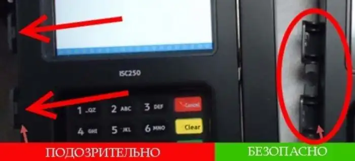 Иногда мошенники выполняют скиммеры в виде реально существующих терминалов, надевая их на более компактные модели. В таком случае нужно обратить внимание на то, как глубоко погружается карточка внутрь аппарата. Если наружу торчит только кончик карточки, скорее всего, это ловушка мошенников.