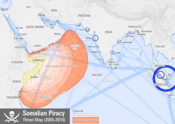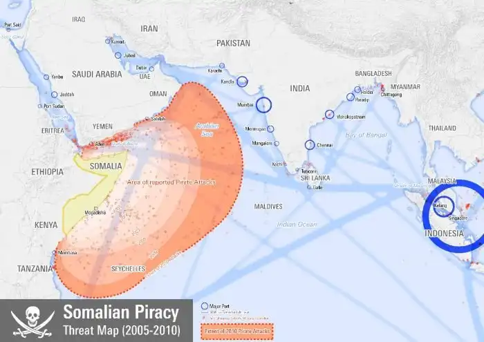 Места нападений сомалийских пиратов в 2005–2010 годах.