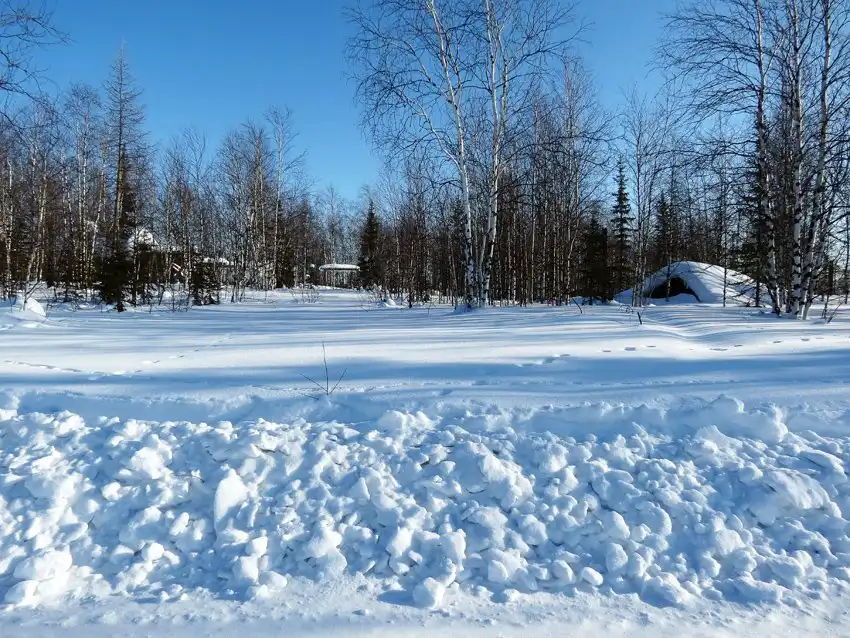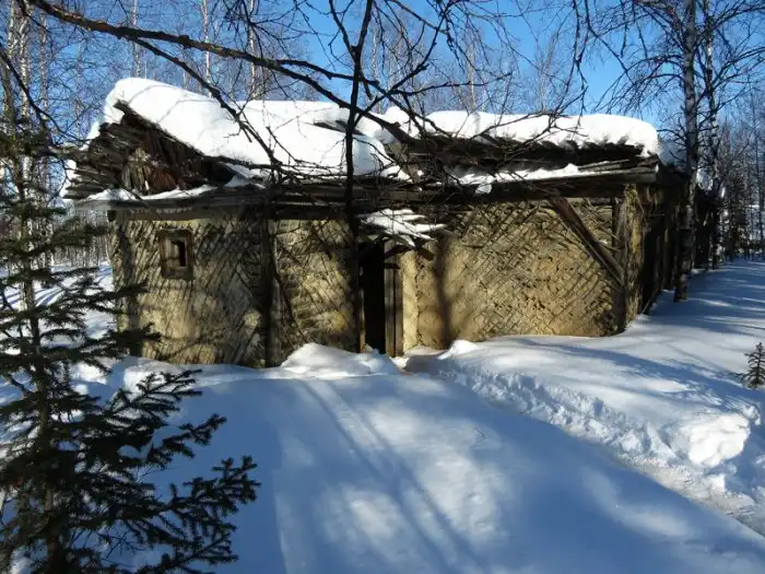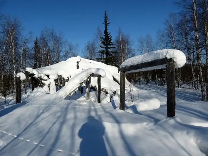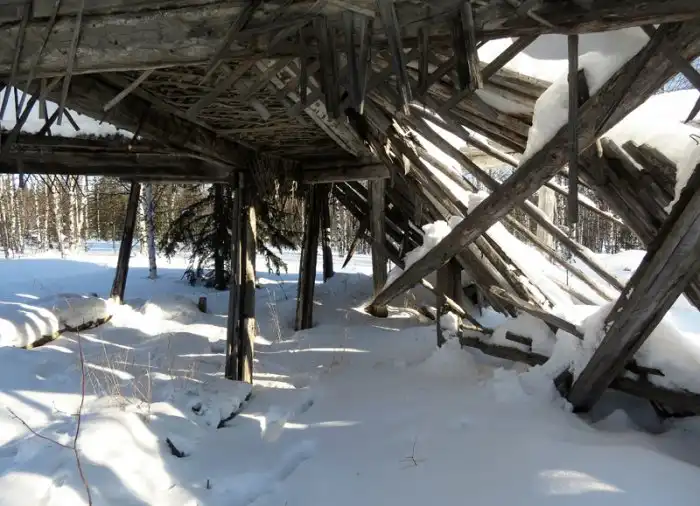 Первый лагерь мы увидели немногим дальше, чем первый мост - на очередном повороте дороги в лесочке над Полуем открылся вот такой вид: руины деревянных зданий, включая торчащую из снега крышу продуктового склада - такие естественные холодильники в мёрзлой земле встречались нам по дороге не раз:
