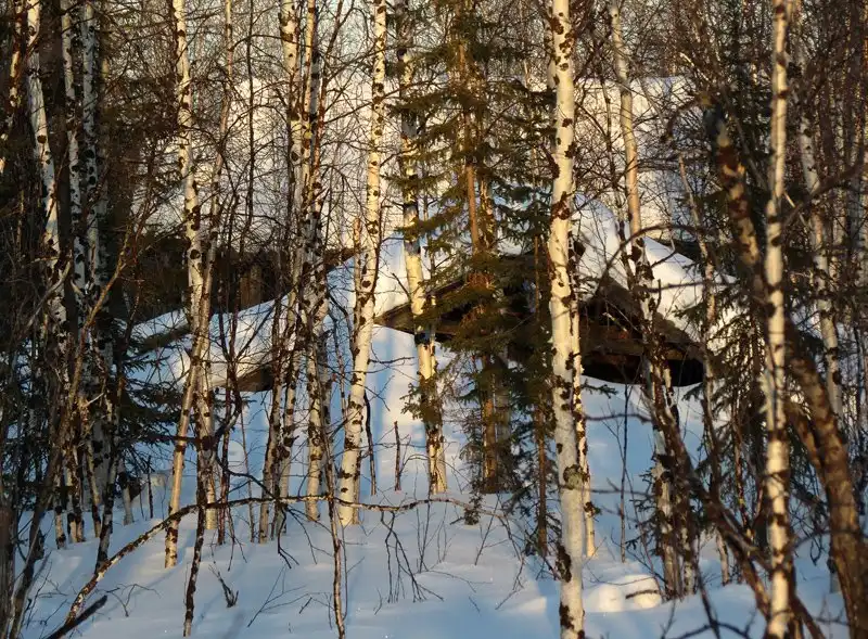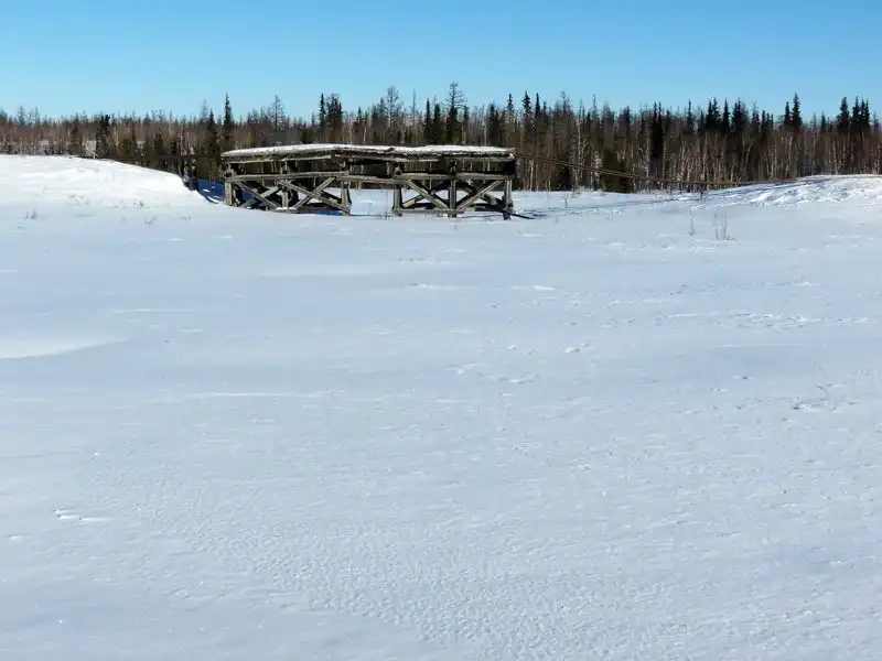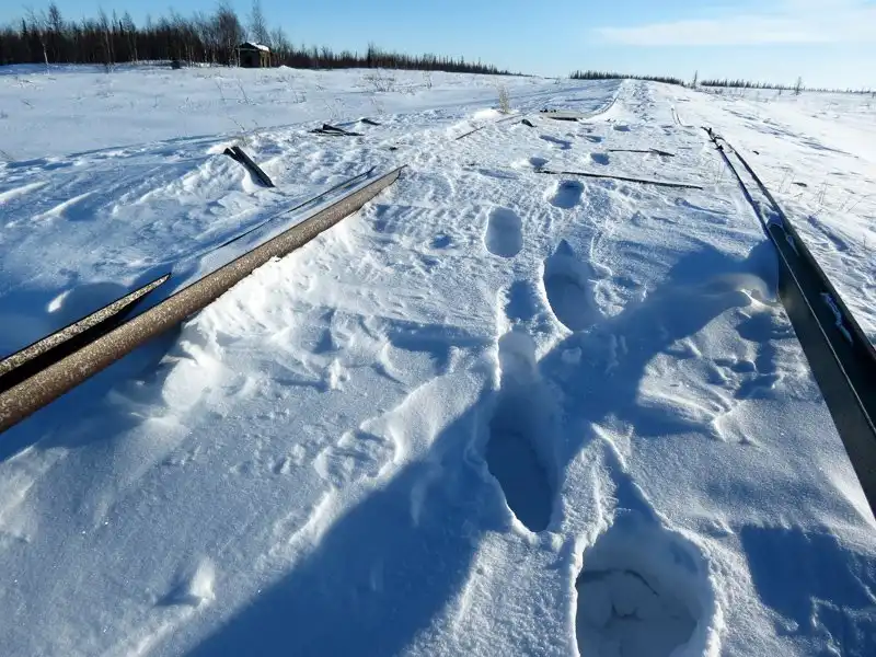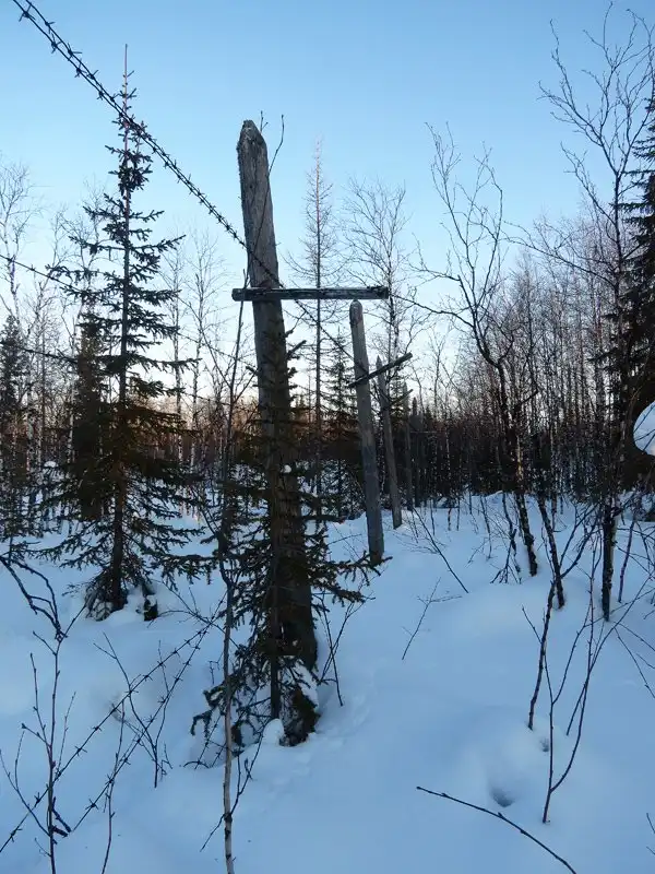 От Салехарда до Надыма дорогу обслуживали 34 лагпункта - их было столько же, сколько разъездов, но при этом с разъездами они не всегда совпадали, и видимо цифра была обусловлена одинаковым "шагом" от объекта до объекта - 8-12 километров. Подробный обзор лагерей с сотнями фотографии есть всё на том же сайте, а я скажу лишь, что искать их оказалось неожиданно сложно: если насыпь - линейна, то лагеря - всё же точки, далеко не всегда стоящие вблизи трассы. Вдобавок, первая от Салехарда четверть Мёртвой дороги и вовсе в стороне от зимника, а там сохранилось несколько очень интересных лагерей: "Кинжальный мыс" (в его бараках полностью уцелели нары), "Прижим-Гора" с многочисленными цветными рисунками на стенах бараков, "Сабельный мыс" с воротами из каркаса и колючей проволоки... Но и на той дороге, что проехали мы, найти что-то не так-то просто. Проехав на закате Русское поле и спустившись в долину Ярудея, мы затормозили у огромного лагеря, вглубь которого вели натоптанные тропы: