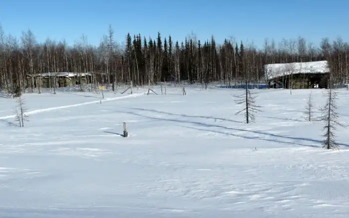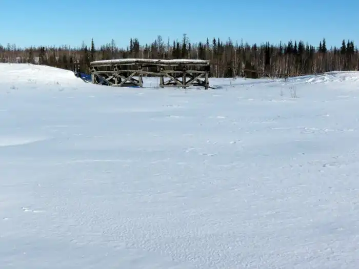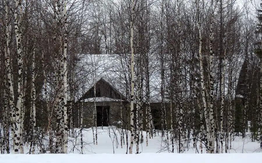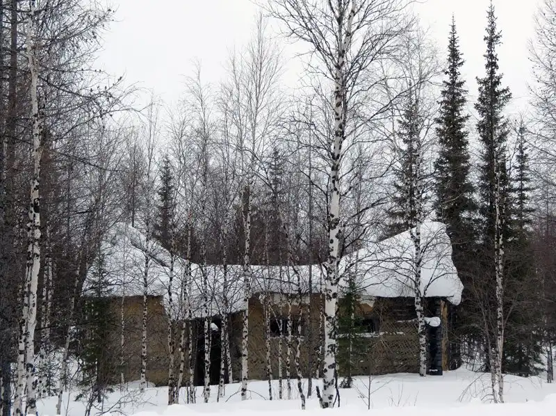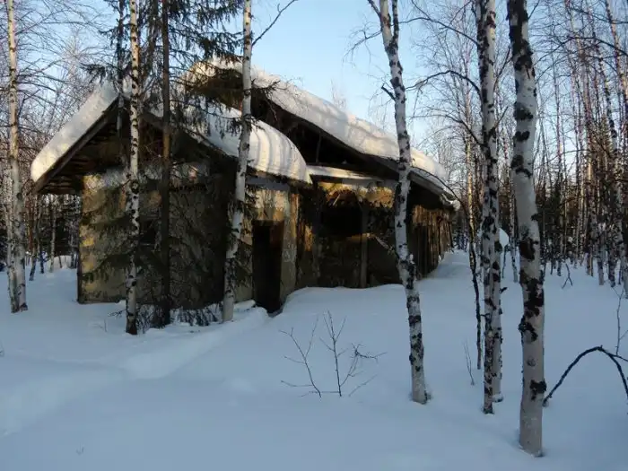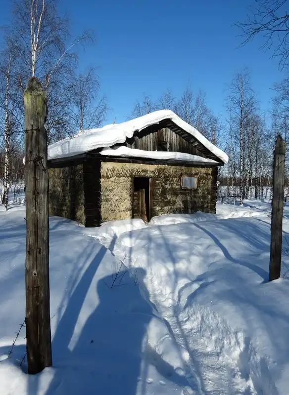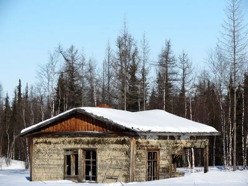 Тогда мы приняли его за Глухариный - самый хорошо сохранившийся из здешних лагерей в самом сердце зимника. Бывавший там прежде Максим вспомнил, что на Глухарином должны быть ворота, но предположил, что они за прошедший год рухнули. На самом деле это какой-то не очень известный, но в целом неплохо сохранившийся лагерь, 21-й по счёту от Надыма. Набор построек в здешних лагерях в общем-то практически типовой - это вот, кажется, вахтовый домик у бывших ворот: