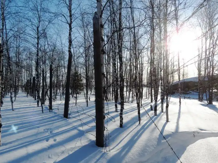 Тропа ведёт в хозяйственную часть. Посреди лагеря - крест, поставленный в 2000 году миссией надымского храма: