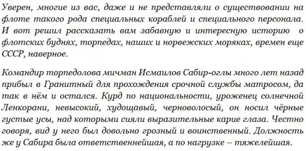 Сабир начал водить торпедолов на высокой скорости вокруг лодки, разгоняя крутую волну. Норвежцев заштормило, временами ставя их лодочку буквально «на попа», почти под 90 градусов. Цепляясь за что попало, обдаваемые солёными брызгами, они видели на мостике торпедолова разъярённого советского мичмана, машущего им кулаком и делающего характерные жесты большим пальцем по горлу, а ветерок доносил к ним понятные и без переводчика: «Аллах… Твою мать… Гяур… Кирдык…».