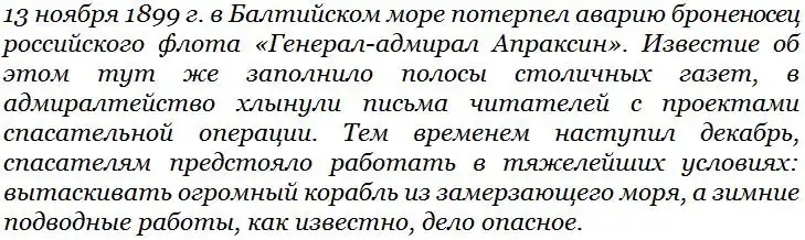Известие об аварии тут же заполнило первые полосы всех столичных газет, и в адмиралтейство хлынули письма читателей с проектами спасательных работ. Среди тривиальных предложений «сдернуть» броненосец с мели, предварительно оснастив его мощными помпами, которые тут же откачают воду и удержат корабль на плаву, поступали и весьма неординарные.