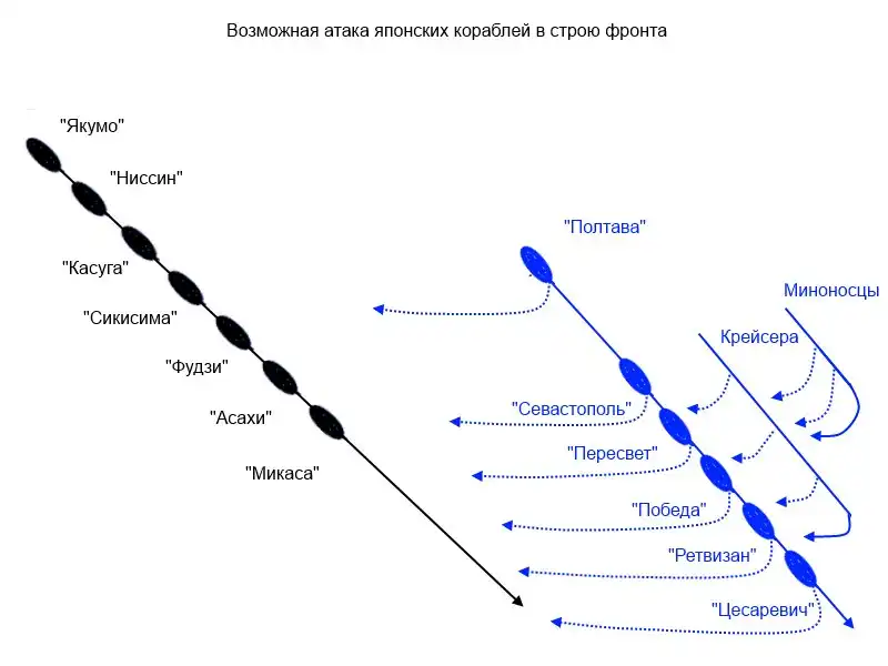 3) Если главные силы японцев все же навяжут бой, эскадра должна без сожаления отказаться от прорыва во Владивосток и вступить в решительное сражение с японским флотом. В бою задача броненосцев состоит в том, чтобы, выждав удобный момент, сблизиться с неприятелем, или даже вовсе смешать строй, стремясь воспользоваться не только артиллерией, но также торпедами и тараном. Задача крейсеров и миноносцев, укрывшись до срока за броненосцами, в нужное время решительно атаковать вражеские броненосные корабли торпедами.