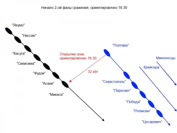 Частично столь низкую точность стрельбы русских кораблей во 2-ой фазе боя можно объяснить указанием В.К. Витгефта стрелять по «Микасе», отчего последний скрывался среди водных столбов от падений снарядов, и корректировать огонь по нему было чрезвычайно тяжело. Поэтому можно допустить, что если бы русские броненосцы строем фронта ринулись бы на японцев и каждый в этом случае выбирал наилучшую для себя цель, то нашим артиллеристам удалось бы достичь несколько большего числа попаданий, чем это произошло в реальности. Также нельзя исключать, что в течение какого-то времени японцам было бы трудно наводить орудия на двигающиеся контркурсами русские корабли, как это произошло с «Ретвизаном», когда тот ринулся в атаку на японский строй. Японцы действительно хуже стреляли на контркурсах, и это давало дополнительные шансы как броненосцам (не получить чрезмерных повреждений при сближении), так и крейсерам и миноносцам, идущих в торпедную атаку…