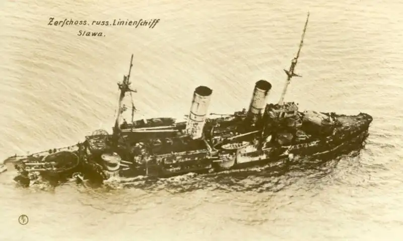В 12 часов 25 минут «Слава» получил 3 подводных попадания ниже броневого пояса. Корабль принял свыше тысячи тонн забортной воды, появился 4-5 градусный крен на левый борт. В 12 часов 39 минут линкор получил еще два попадания.