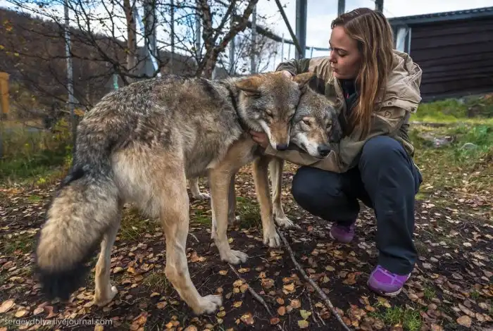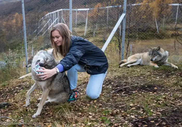 Настя сначала боялась, потом привыкла и начала делать селфи с хищниками. Волки подыгрывали: