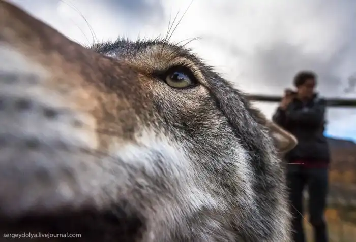 Надо заметить, волки очень любознательны. Участником аттракциона "Поцелуй волка" стал так же и мой Никон: