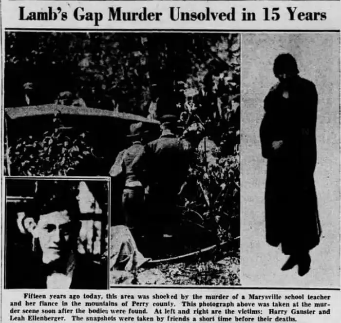 17 мая 1924 года недалеко от местечка Лэмбз Гэп местные жители обнаружили трупы мужчины и женщины в лесу, в припаркованной машине. Они были застрелены из охотничьего ружья. Это оказались житель Мэрисвилля Гарри Ганстер и местная учительница Лея Элленбергер. Молодые люди были возлюбленными, с некоторых пор были помолвлены. Их роман не был ни для кого секретом, недоброжелателей у них не было. В этот день пара отправилась в лес собирать цветы. Кто и за что убил молодых людей? Быть может, это был тайный воздыхатель Леи или случайный контрабандист? Полиция искала убийц больше 10 лет, но так и не смогла пролить свет на это дело.