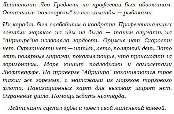Факт есть факт. Три из одиннадцати спасшихся транспортов каравана PQ-17 были личной заслугой лейтенанта Гредвелла. Его наградили Крестом за доблестную службу. А сразу по возвращении перевели на противолодочный корвет HMS Thirlmere — еще более убогий баркас, чем предыдущий “Айршир”.