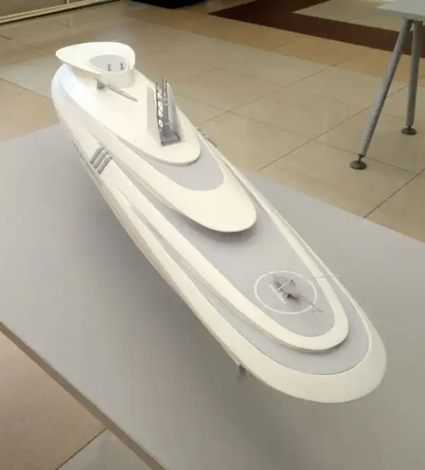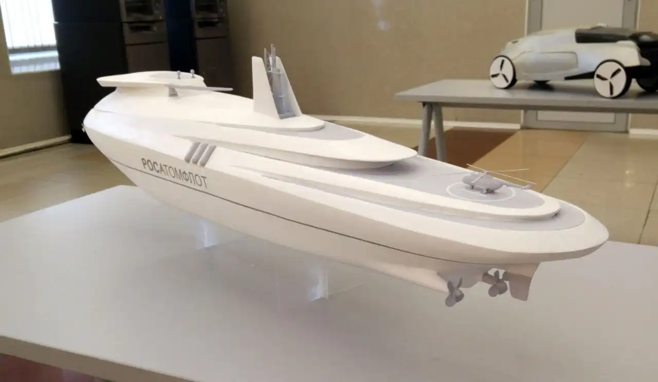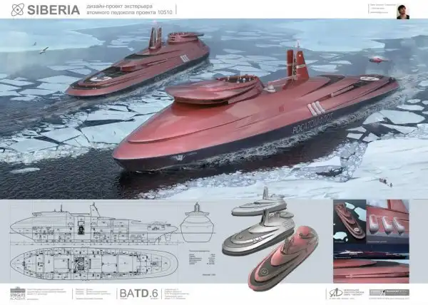 Руслан Штепин: «Максимально скрытая палуба, которая защищена от обледенения при использовании в Арктике. Ледокол многофункциональный, его можно использовать для разных задач, соответственно, он должен выглядеть нейтрально. При разработке облика я отталкивался от авиационного образа, потому что самолет - это символ воплотившейся мечты. Атомный ледокол - это тоже своего рода воплотившаяся мечта. Ведь это первое судно, которое добралось до Северного полюса. Длина моего ледокола - 150 метров, ширина - 20 метров. Это курсовая проекта сделанная в сотрудничестве с ЦКБ Айсберг.»