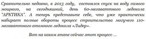 В декабре 2016 года давно обсуждаемая идея строительства атомного ледокола «Лидер» стала обретать реальные черты. Крыловский государственный научный центр после долгих исследований и вычислений согласовал с ЦКБ «Айсберг» окончательный облик будущего хозяина Арктики. На этом гадательный этап в духе «будет — не будет» и «а если будет, то каким?» можно считать завершенным. Проекту ЛК-110Я официально дан зеленый свет, концепция его сформирована.