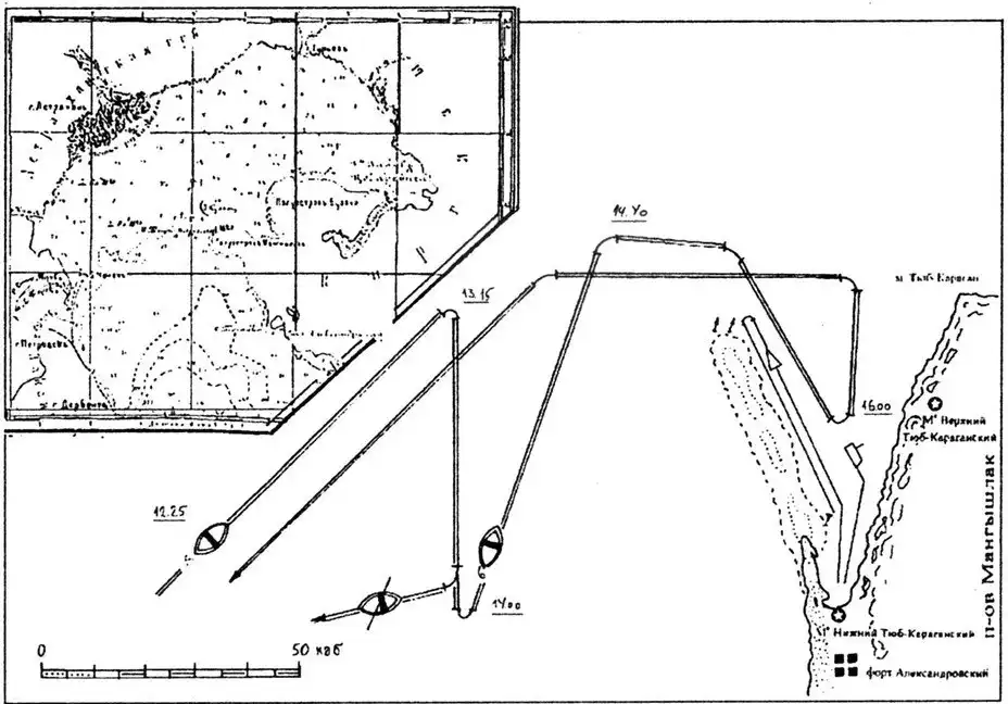 Расположение судов в Тюб-Караганском заливе к концу боя