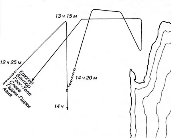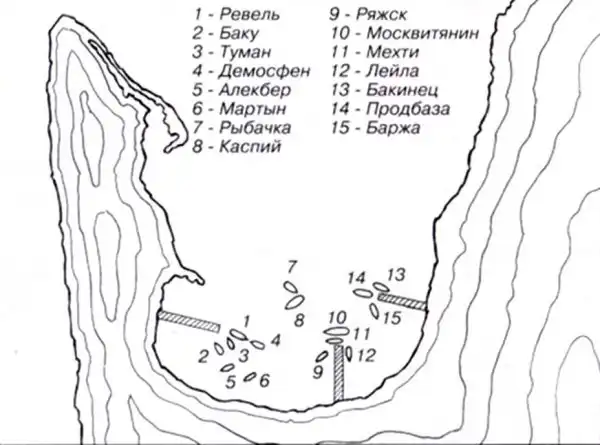 - вспомогательные суда «Бакинец», «Ряжск», «Крейсер», «Лейла», «Гельма».