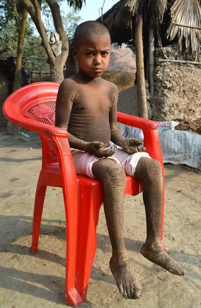 8-летний Мехенди Хасан из Бангладеша привык прятаться от людей из-за своей кожи. Заболевание мальчика пока еще не диагностировано официально, возможно это одна из форм ихтиоза. Тело мальчика покрыто толстой шелушащейся кожей, похожей на чешуйки.